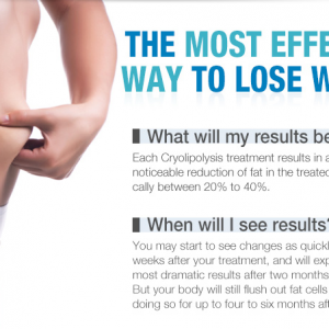 Cryolipolysis is the non-invasive fat freezing procedure – the breaking down of fat cells – to reduce body fat without damage to other tissues. Lipids from the fat cells are slowly released and transported by the lymphatic system to be processed and eliminated, much like that of fat from food. Each treatment can reduce from 25 – 30% fat in the area of treatment. The full effects of the treatment can be seen after 90 days.